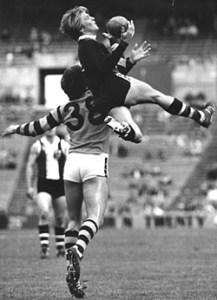 St Kilda’s Trevor Barker taking a mark over Hawthorn’s Robert Mace in 1981.